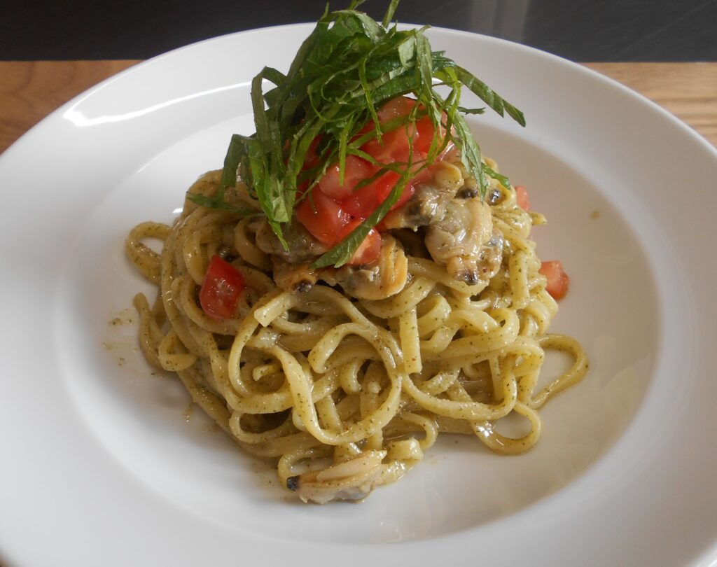 少し苦味のある大葉と、ナッツ、にんにく、オリーブオイルで作ったジェノベーゼソースに、あさりの旨味が合わさって…