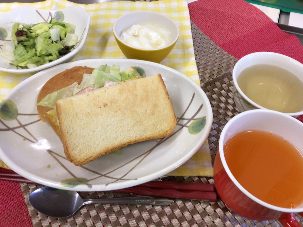 今日の昼食は、ホットサンド、ジャムパン、フレンチサラダ、はちみつヨーグルト、野菜ジュースです。