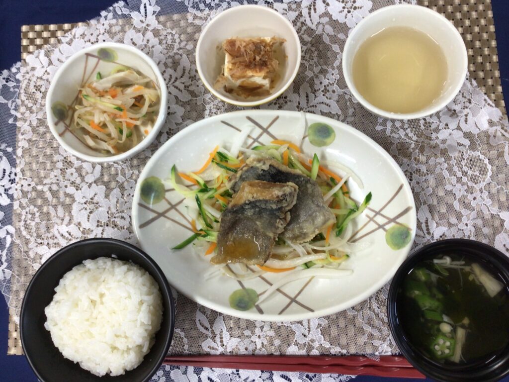今日の昼食は、鯵の南蛮漬け、湯豆腐、もやしの胡麻和え、オクラのすまし汁です。 鯵は今が旬のため、身の厚いサクサクな南蛮漬けに仕上がっています☺︎ …