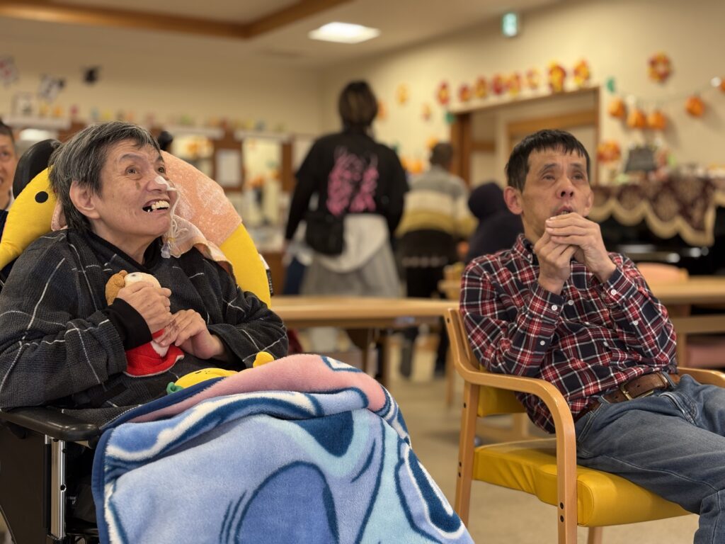“歌う振付師パーツイシバ”さんを師匠と慕う利用者さんがパーツ師匠とそのお仲間たちとパフォーマンスをしてくださいました!まずは利用者さんによるパーツ師匠とお仲間たちの紹介から♪その後は、ギターに合わせて…