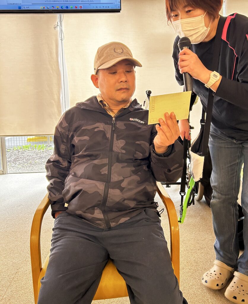 11月生まれの方のお誕生日会をしました。スライドショーを見たのち、メッセージカード等をお渡ししたあと、お誕生日の歌と季節の歌「もみじ」をみんなで歌ってお祝いしました(^^♪ 余興は、ルーレットゲ…
