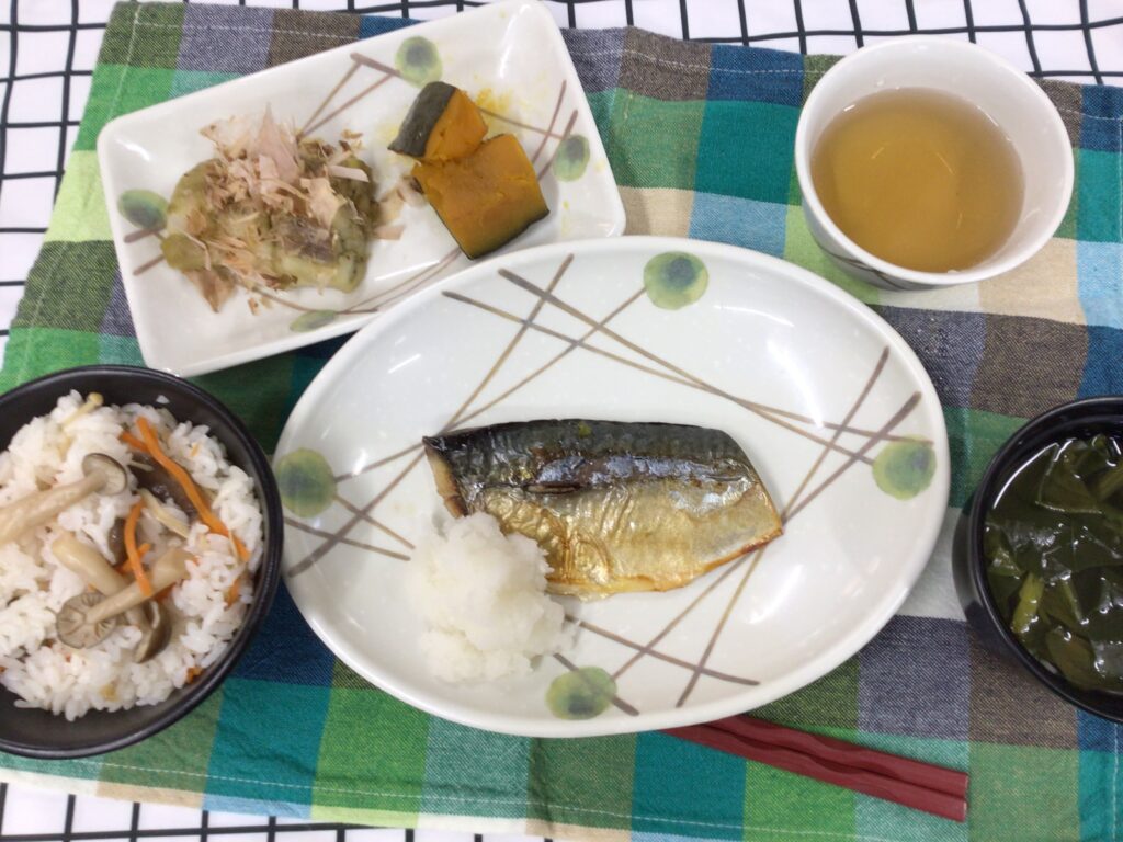 今日の昼食は、きのこごはん、塩サバの焼き物、かぼちゃの煮物、焼き茄子、すまし汁です。