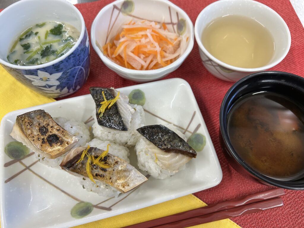 今日の昼食は、焼きサバ寿司、海鮮茶わん蒸し、紅白なます、赤だし味噌汁です。