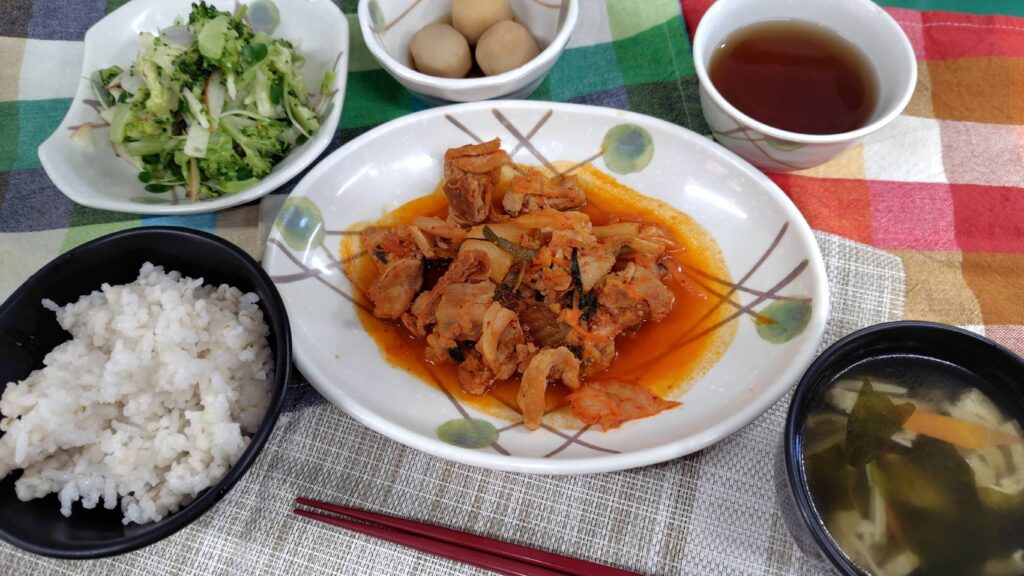 今日の昼食は、ごはん、豚キムチ炒め、里芋の煮物、 ブロッコリーとりんごのサラダ、すまし汁です。