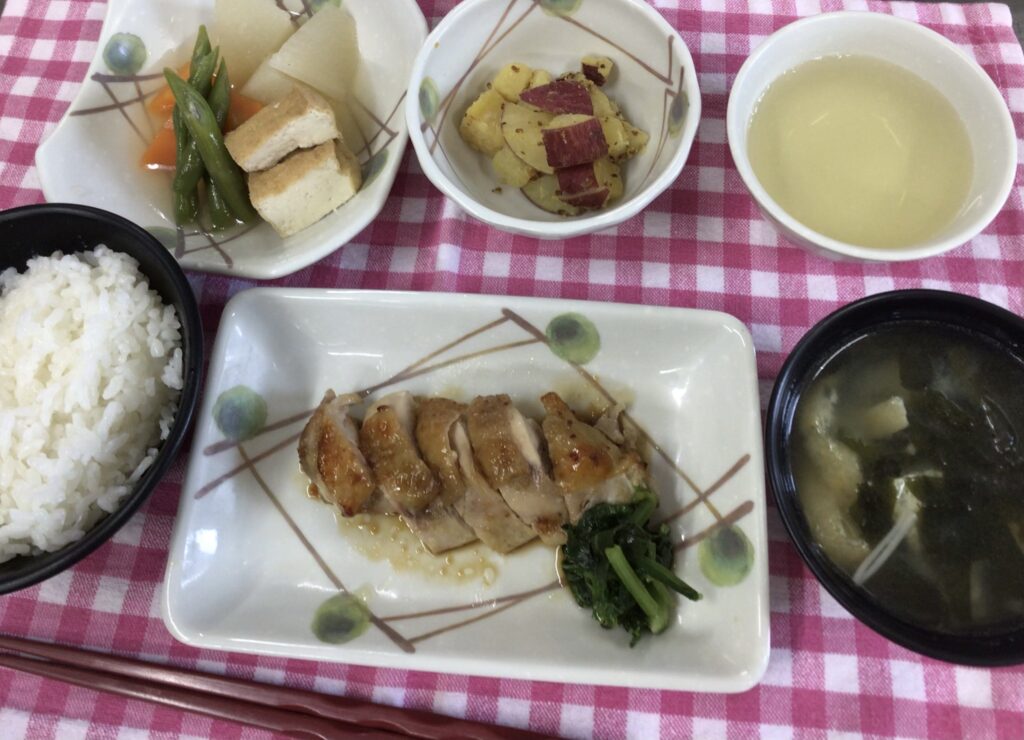 今日の昼食は、鶏肉のにんにく焼き、炊き合わせ、さつま芋のハニーマスタード、味噌汁です☺︎ 今日は、園芸活動で育てている人参と小松菜を収穫したので一緒に調理しています☆ 人参は炊き合わ…