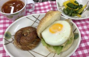 今日の昼食は、月見バーガー、チョコフラワー、アスパラの炒めサラダ、ミネストローネ