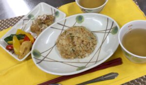 今日の昼食は、チャーハン、唐揚げ、野菜スティック、中華スープ