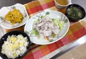 今日の昼食は、さつま芋ごはん、豚しゃぶ、カボチャサラダ、味噌汁