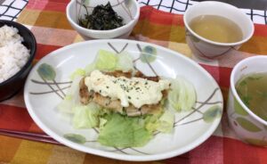 今日の昼食は、チキン南蛮、青菜のからし和え、ワカメスープ