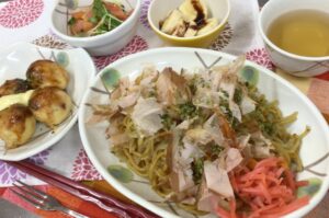 今日の昼食は、焼きそば、たこ焼き、トマトサラダ、チョコバナナ