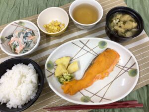 今日の昼食は、鮭の紅葉焼き温野菜、ほうれん草の白和え、コーンバター、味噌汁