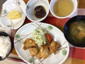 とり天、添え野菜、干し椎茸の煮物、けんちん汁、さつま芋のじり焼きです。