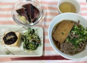 今日の昼食は、きつねそば、かつおのたたき、酢の物、豆腐のみそ焼き