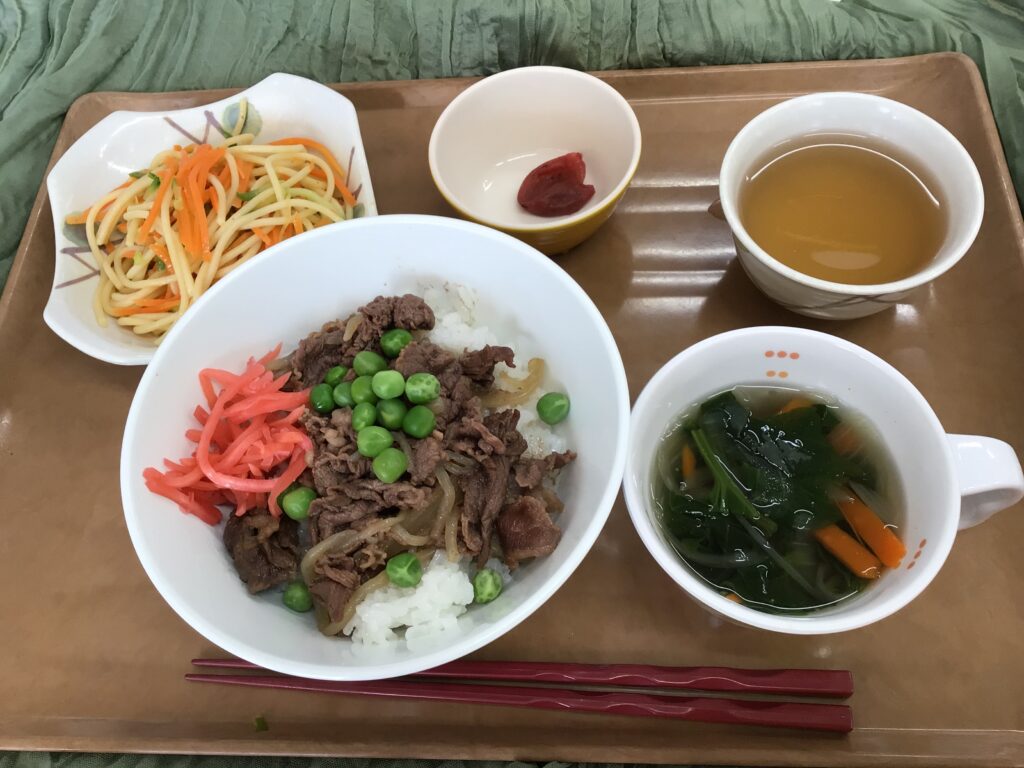 今日の昼食は、牛丼、スパサラダ、MORE産梅干し、野菜スープ
