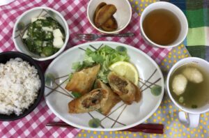 今日の昼食は、手作り春巻き、長芋オクラ和え、チキンボールスープ、はちみつりんご