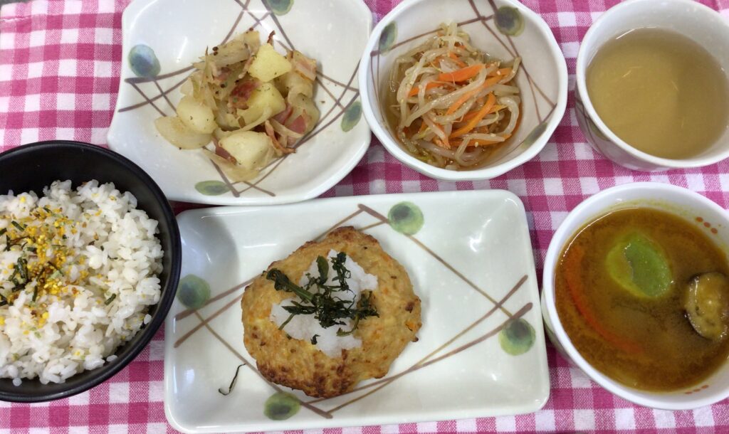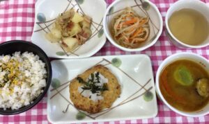 今日の昼食は、ふりかけご飯、豆腐ハンバーグ、ジャーマンポテト、もやしのナムル、スープカレー
