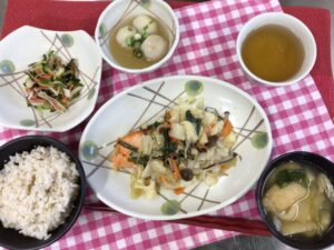 今日の昼食は、鮭のちゃんちゃん焼き、里芋のみぞれ餡かけ、酢の物、味噌汁
