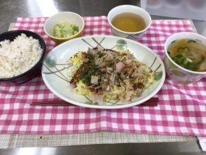 今日の昼食は、ごはん、お好み焼き、白菜の漬物、野菜スープです。