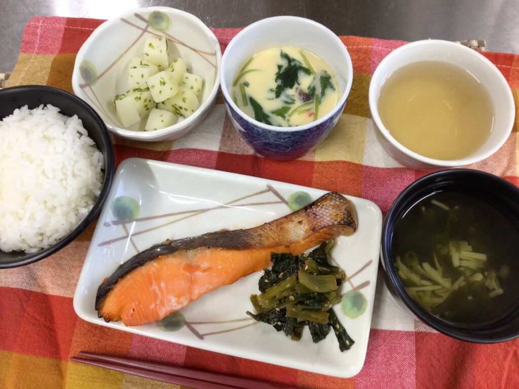 今日の昼食は、ごはん、鮭の塩麴焼き、小松菜のごま炒め、茶わん蒸し、青のりポテト、すまし汁です。