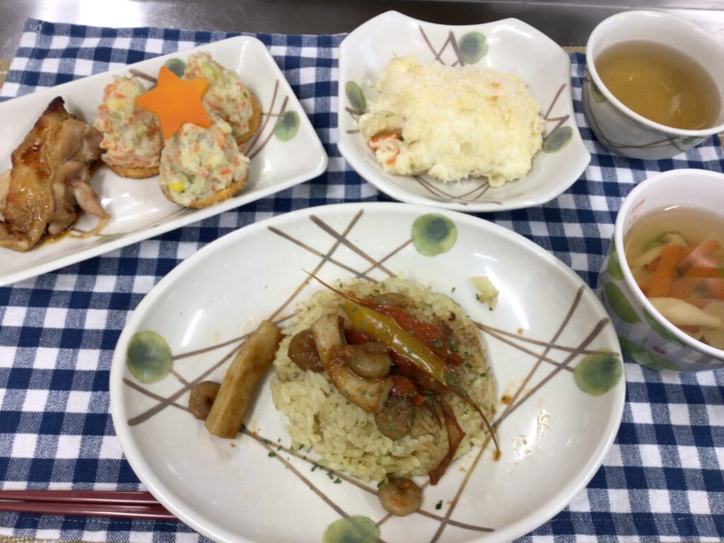 パエリア、照り焼きチキン、マカロニグラタン、ポテトサラダ、野菜スープです☆