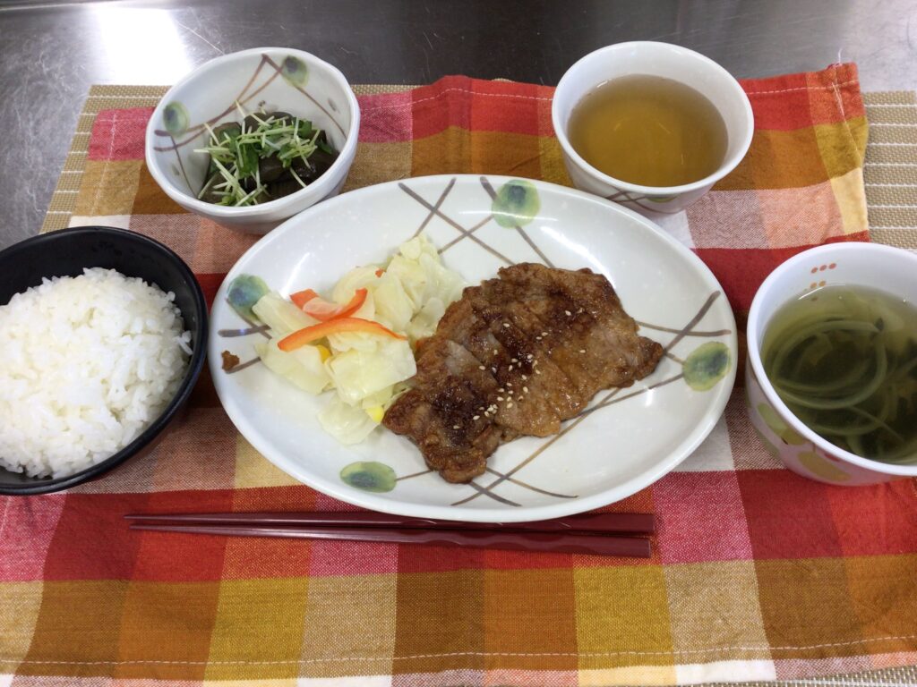 今日の昼食はごはん、トンテキ、温野菜、茄子の煮物、わかめスープです