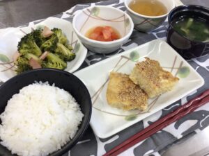 今日の昼食は、鶏肉の松風焼き、トマトのお浸し、ブロッコリーサラダ、ほうれん草の味噌汁です