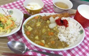 今日の昼食は、エビフライカレー、コールスローサラダ、ホットミルク、はちみつヨーグルト
