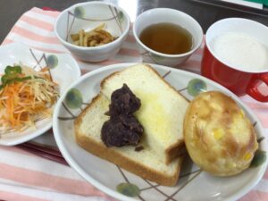 今日の昼食は、小倉トースト、コーンマヨパン、大根サラダ