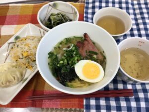 今日の昼食は、味噌ラーメン、半チャーハン、餃子、酢の物、鶏だしスープ