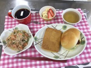 ツナサラダ、コーヒー、イチゴ・バナナのフルーツ盛り です