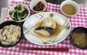 今日の昼食は、炊き込みご飯、ぶり大根、小松菜のお浸し、豚汁、チョコパイ