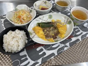 今日の昼食は、ごはん、蒸し芋、ポークピカタ、オクラのオイル焼き