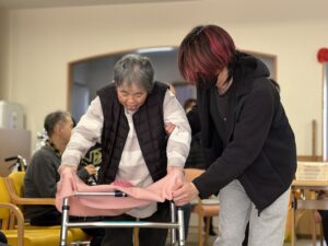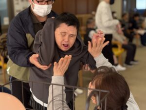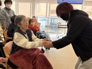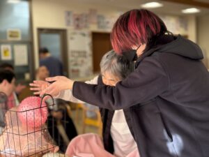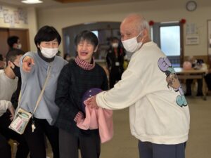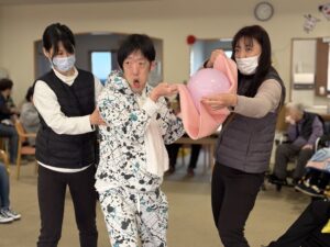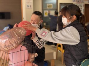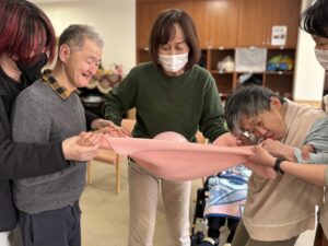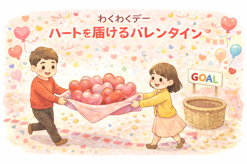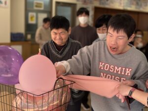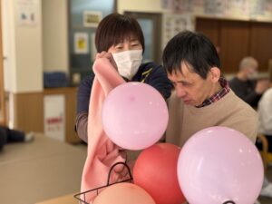 バレンタインイベントとして、ハート型の風船やピンク色のボールを運ぶゲームを行いました。