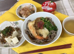 今日の昼食は、梅おろしぶっかけそば、じゃこピー奴、焼き茄子とろろ、ソフール