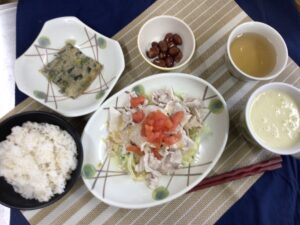 今日の昼食は、ごはん、豚しゃぶサラダ、野菜のチヂミ、
