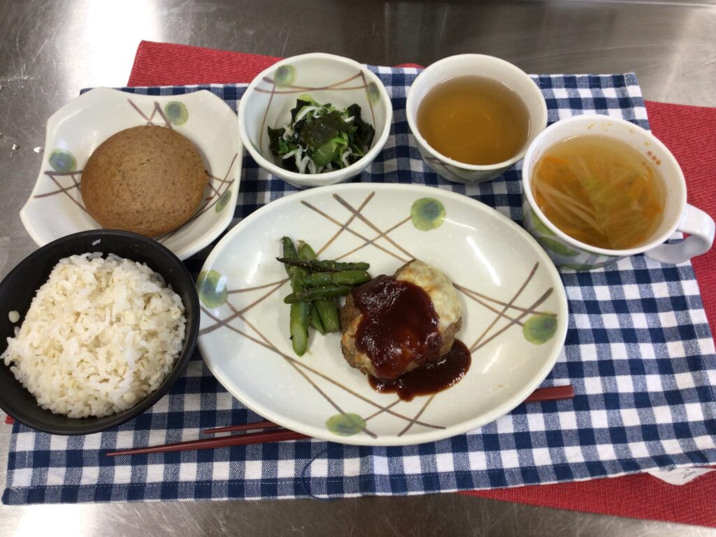今日の昼食は、チーズハンバーグ、アスパラ炒め、豆苗サラダ、チョコパンケーキ