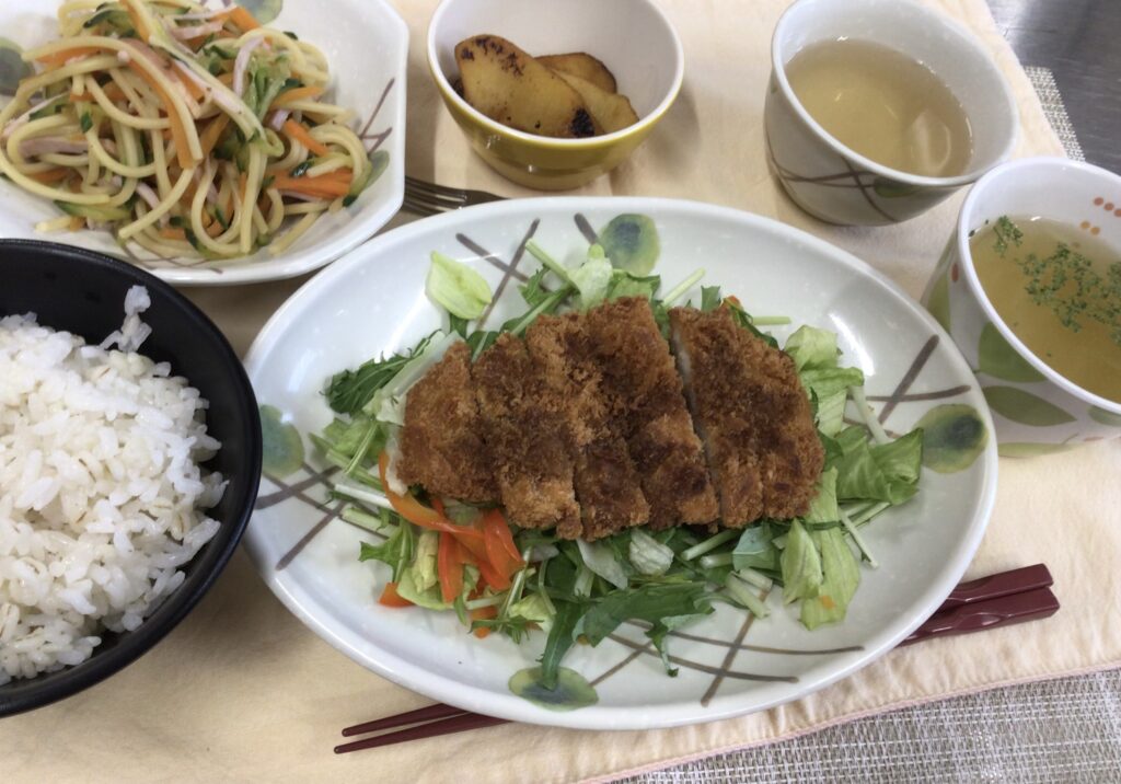 今日の昼食は、とんかつ 添え野菜、スパサラダ、オニオンスープ、はちみつりんごです☺︎
