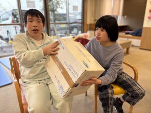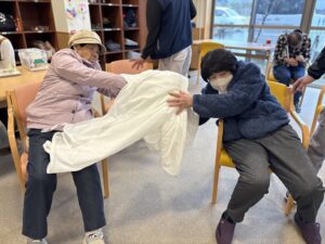 ケーキの土台を作るため、みんなで段ボールとシーツを運びました。