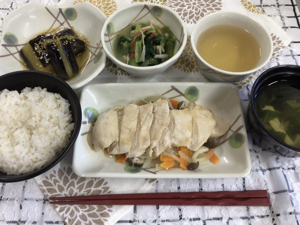 今日の昼食は、鶏肉のゆず風味蒸し、小松菜のからし和え、茄子の揚げ浸し、筍のすまし汁