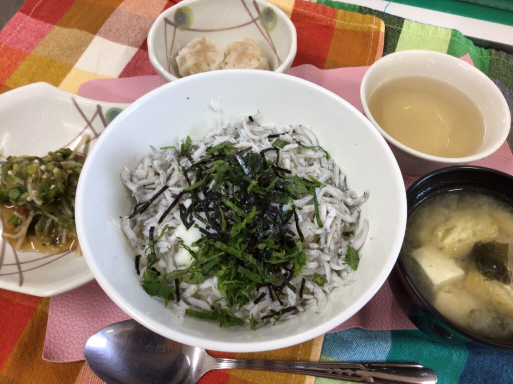 今日の昼食は、しらす丼、しゅうまい、オクラの梅和え、味噌汁です☺︎