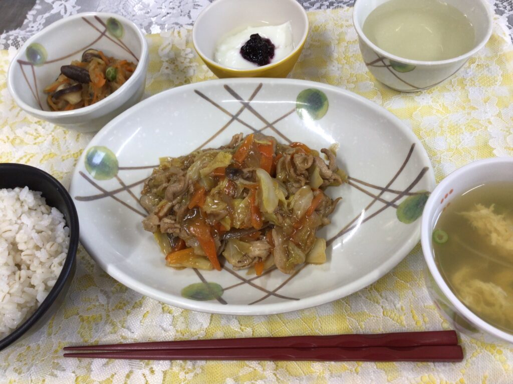 今日の昼食は、豚肉のオイスター炒め、切干大根、卵スープ、ブルーベリーヨーグルトです☆