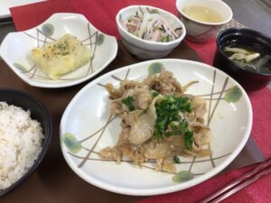 今日の昼食は、豚肉の生姜焼き、じゃが芋チーズおやき、春雨サラダ、すまし汁です☆