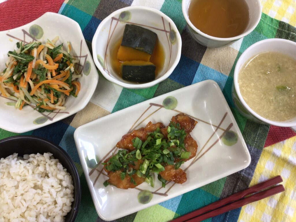 今日の昼食は、ごはん、ヤムニョムチキン、大根サラダ、かぼちゃの煮物、レタススープです☆
