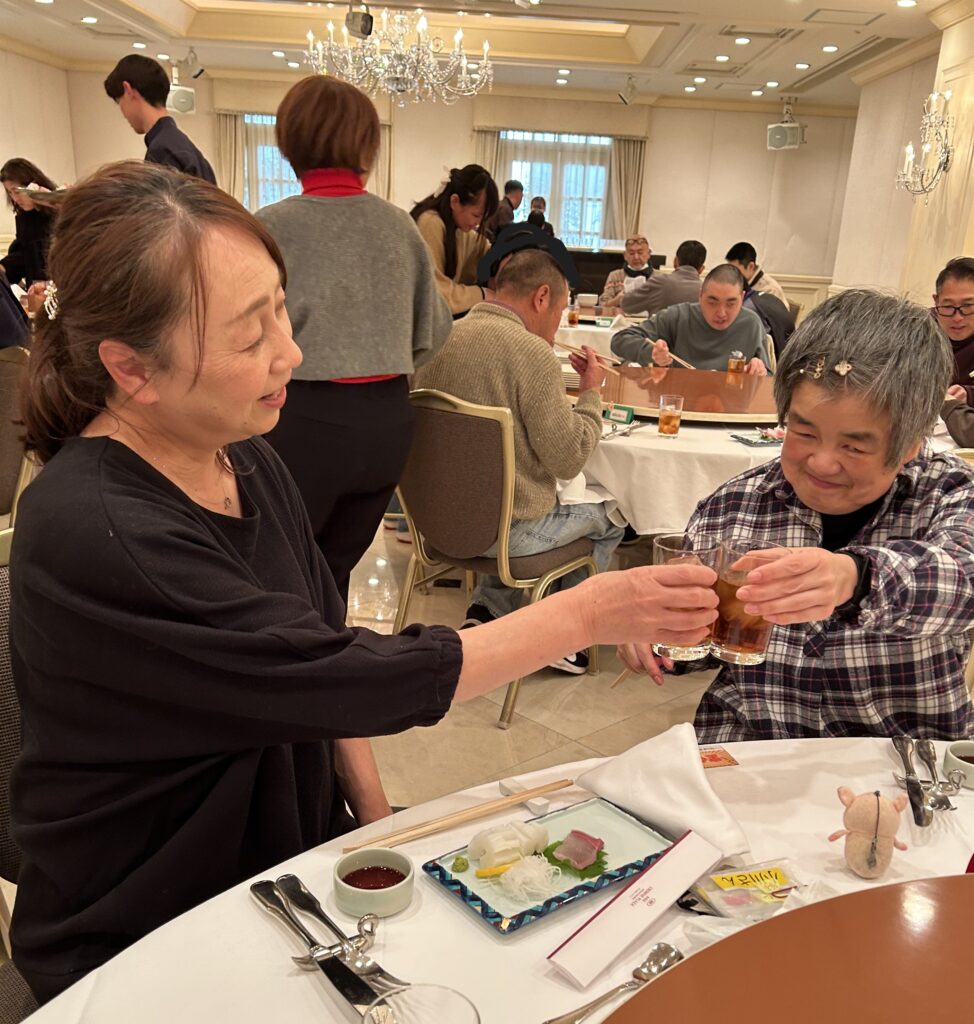 今日は2グループの忘年会です。 1グループから「エビチリが美味しかったよ」「豪華やったよ」といろいろお話をいただき、 皆さんワクワクが募っていきました!(^^)! 会場に到着!! 始めの挨拶で…