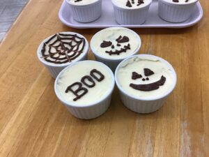 今月の調理では、もうすぐハロウィンということで、ハロウィンのデザインをのせたかぼちゃのカップケーキを作りました。👻🎃