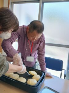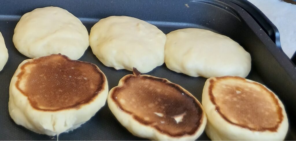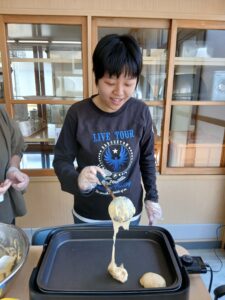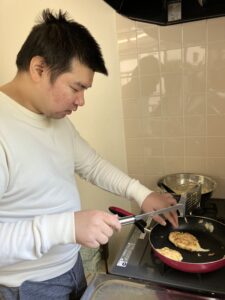 ボウルに豆腐、卵、ホットケーキミックス、牛乳を混ぜてなめらかな生地を作り、お玉ですくって焼きます!